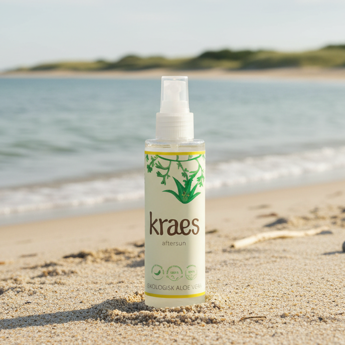 Naturlig, forfriskende og fugtgivende aftersun gel med økologisk Aloe Vera, som føles kølig og beroligende på dit barns hud. KRAES aftersun indeholder et aminosyre-kompleks, hvilket giver hudens fugtbalance et ekstra boost, der kan være tiltrængt efter en lang dag i solen.