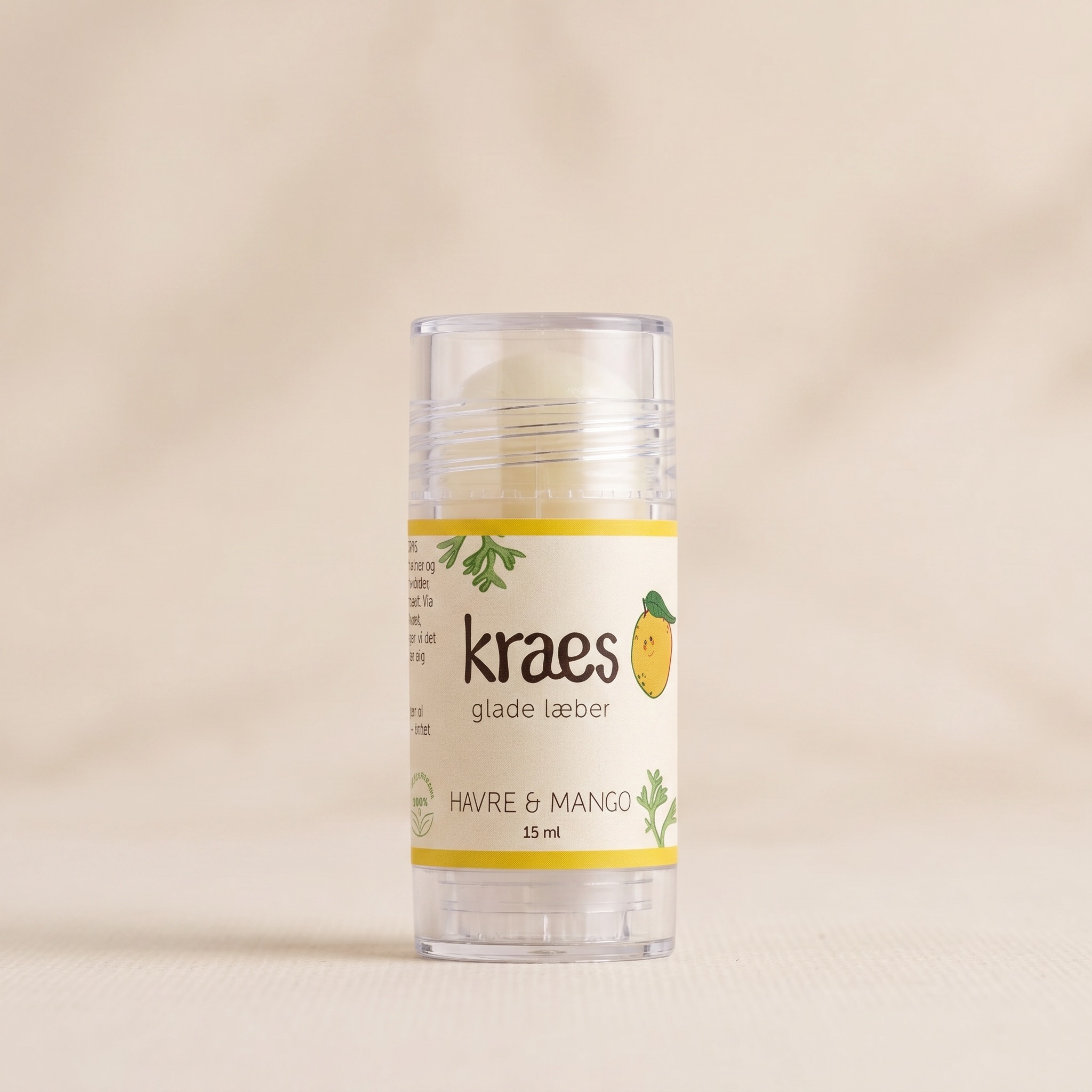 KRAES glade læber indeholder udelukkende naturlige ingredienser, hvorfor du også kan bruge plejesticken til at lindre sarte brystvorter uden at bekymre dig om, hvorvidt dit barn bliver udsat for unødvendig, syntetisk kemi. Den indeholder havreolie, kokosolie, sheasmør, mangosmør, castorolie, abrikoskerneolie, bivoks og intet andet!